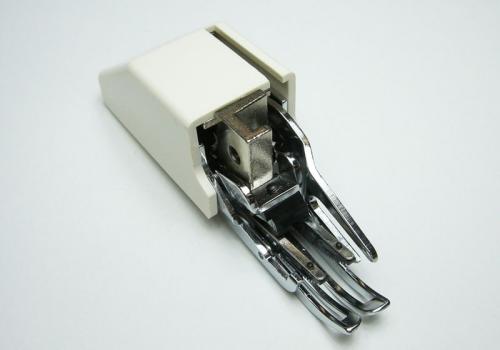 押えに上送り歯が付いており、ミシンの送り歯と連動して生地を挟んで送るため、縫い詰まりや縫いズレを防ぎます。