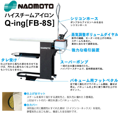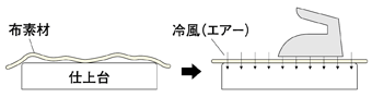 ”Q-ing”は、アイロンから噴出された大量のスチームで繊維を充分湿らせたあと、アイロンがけと同時に蒸気を残さず仕上台が吸い込む、画期的なシステムです。