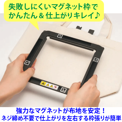 同梱のマグネット枠(10×10cm)は強力なマグネットで生地を挟み込むことができるため、布にしわができにくく、簡単に枠張りができます。