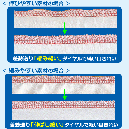 ニット素材など、伸縮性のあるものを美しく仕上げる機能です。伸ばしぬい、縮めぬいがダイヤル操作で自由自在。ギャザー寄せ、リブ付けもラクラク。袖山のいせ込み、スカートのヘム上げなどにも便利です。